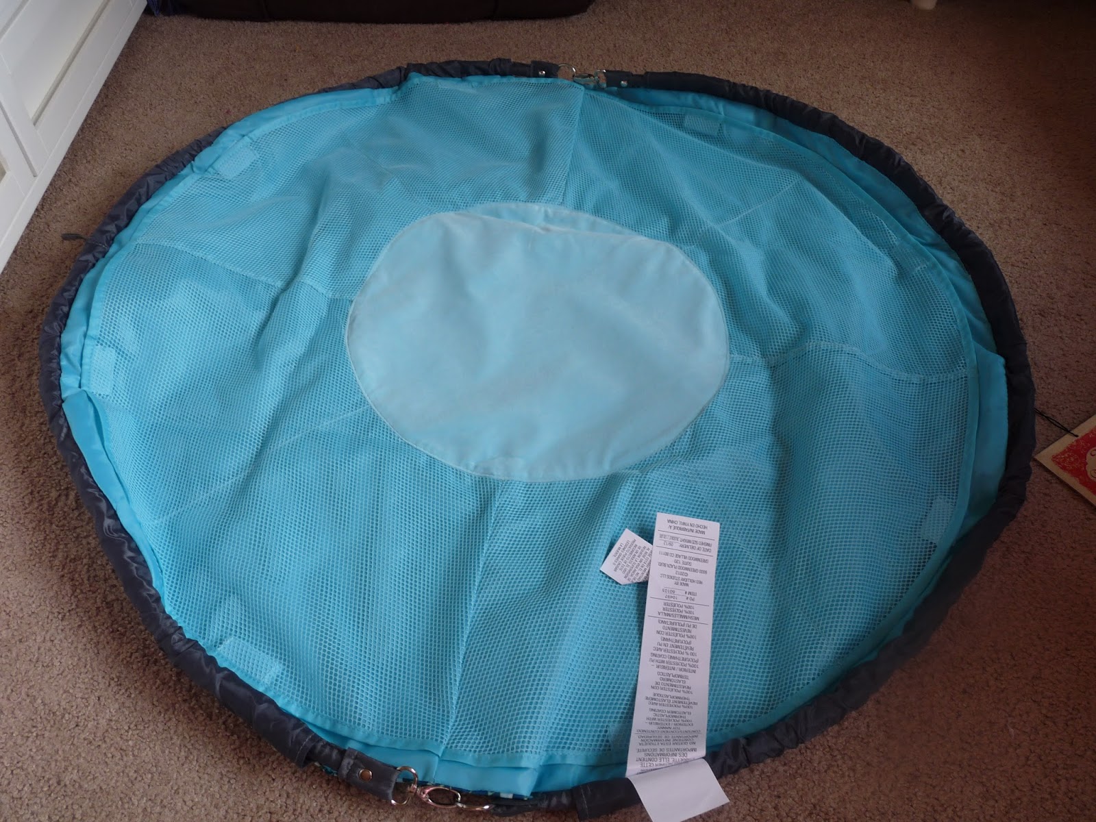 The outside that lays flat on the floor is completely water resistant so you have no fear of your little one getting wet while playing and also prevents spills from soaking through. It also has 8 pockets where you can store little things all secured by a velcro tab. Mommy decided to put a book and a few diapers in there. With 8 pockets your possibilities are endless.