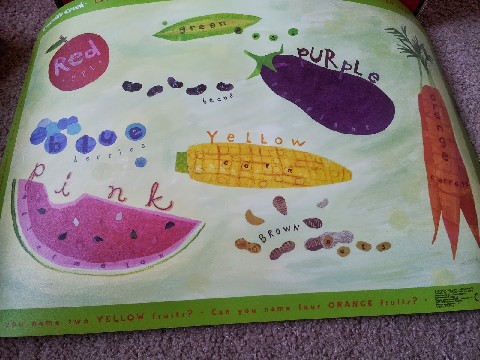 This is my very first placemat that is just for me. Its the Harvest of Color placemat by Crocodile Creek and we loved the bright illustrations of fruits and vegetables. This is not only pretty but educational as well since it not only lists the fruits and veggies but the colors. Such a handy teaching tool don’t you think?