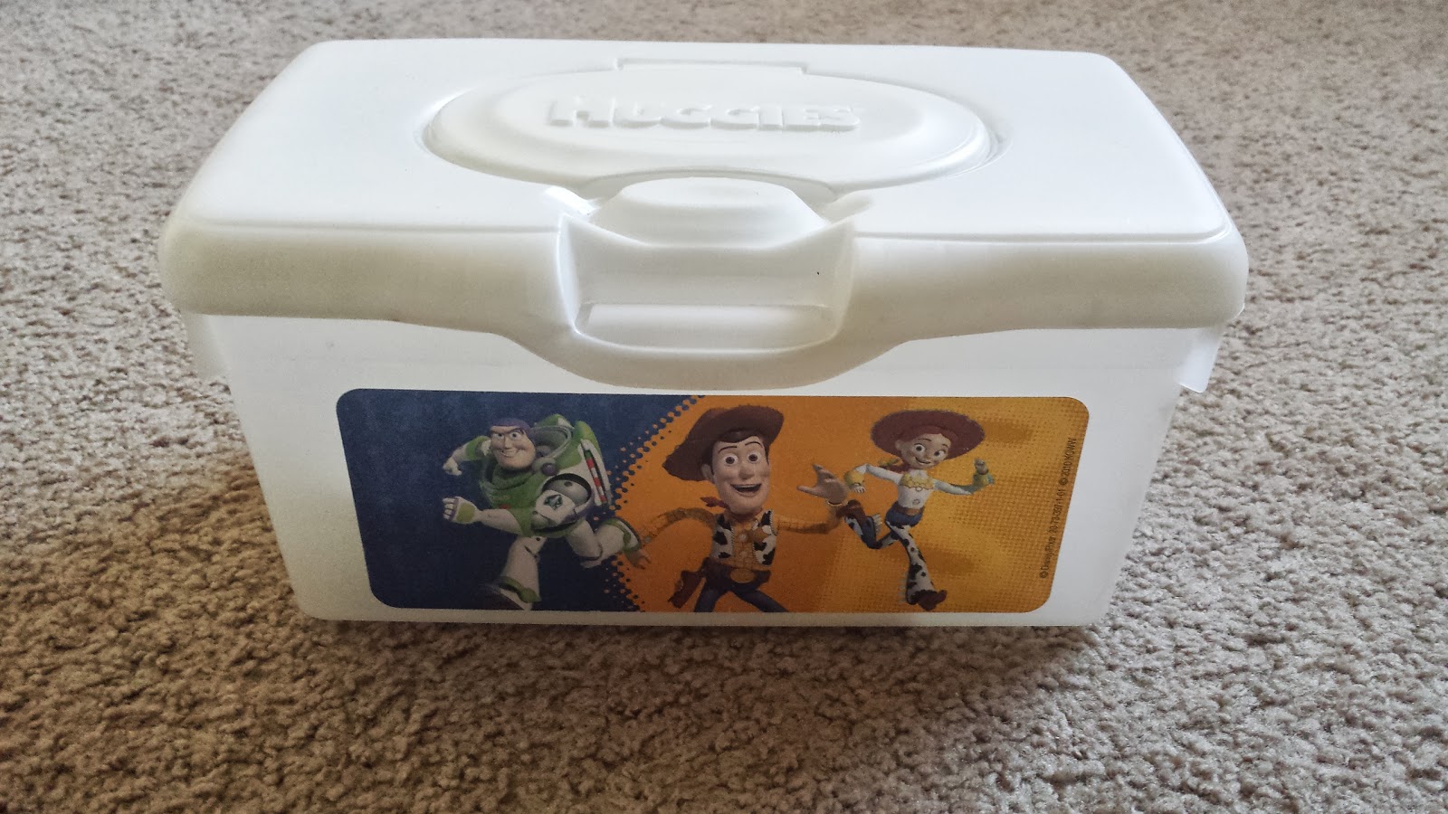 Is that a pampers tub? Yes, yes it is. Well what about Huggies, does it fit those too? I’m glad you asked. Yes as a matter of fact it does. Since daddy doesn’t know much about buying wipes, one day mommy sent him to the store to get a refill and he brought back a Huggies tub so we had one laying around and guess what? They fit! The fit isn’t as great as on the Pampers tub but can you really tell the difference?