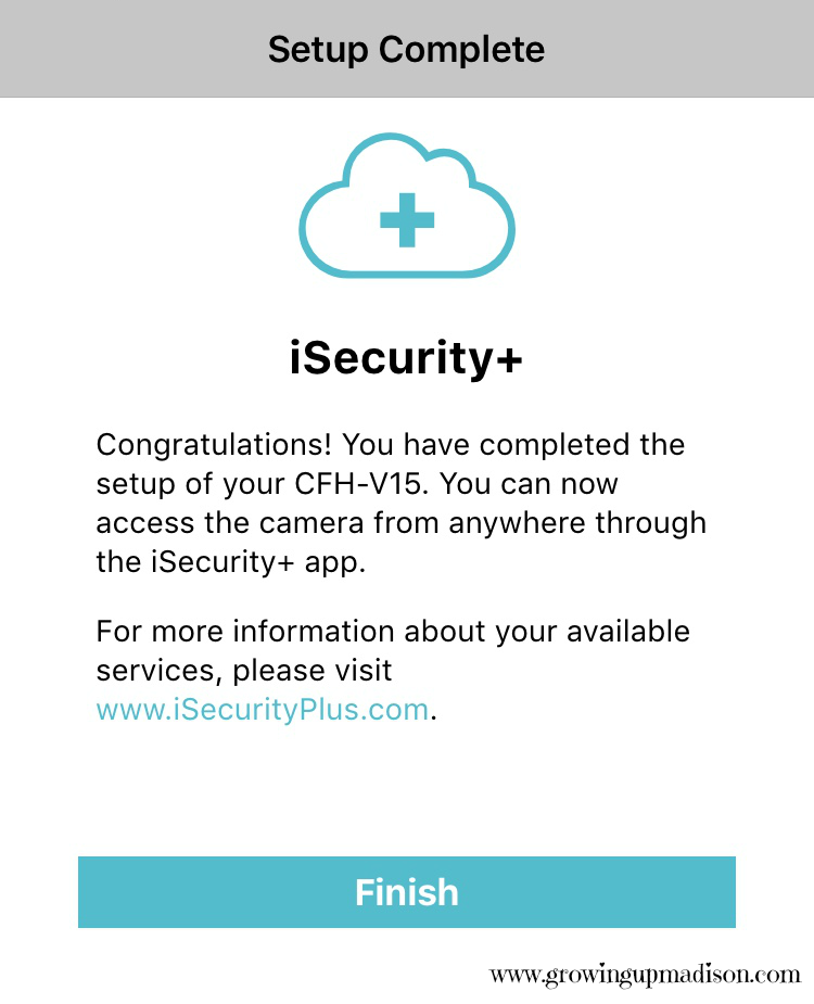 Set up of the video monitor was a breeze. Included in the box was the video monitor, the power supply cord, mounting screws and the instruction manual. First I needed to download the iSecurity+ app which I found easily in the app store. I plugged in my video monitor to a power outlet and the camera rotated and the light flashed green indicating that my monitor was ready for set up. I connected the video monitor to my home network then set up the app. Remember you need to set up the camera BEFORE the app. I was able to create a username and password and then we were ready to go.