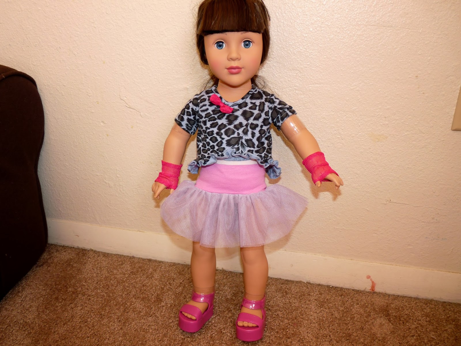 She came with this really cool purple teeshirt, a tutu skirt, pants and a belt. Her clothes are fully removable and it was fun changing her outfit and just having her in just her tee and skirt. She’s going to need more clothes but there is a huge market for 18″ doll clothing so it shouldn’t be a problem finding her some.