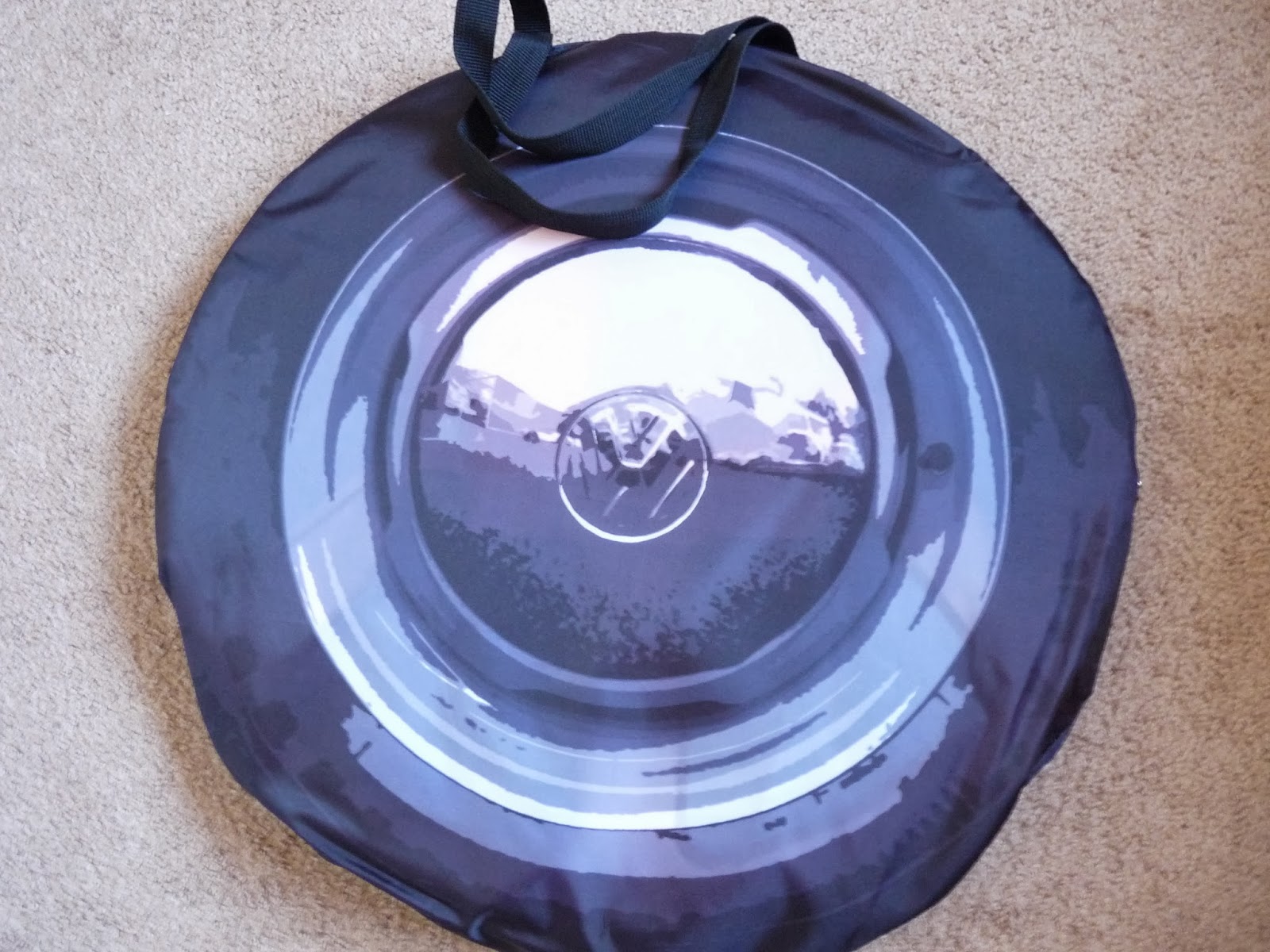 From the title of my post and the follow up photo I’m sure you’ve figured out what it is. It’s a 1965 VW Camper Van Play Tent. I had never seen one of these vans before but apparently mommy and daddy had. I had forgotten they were around when the dinosaurs roamed the earth. This is V. W. licensed and built to (scaled down) spec. It even came in this really cool VW wheel case so it’s very portable and be taken around with you like a bag.