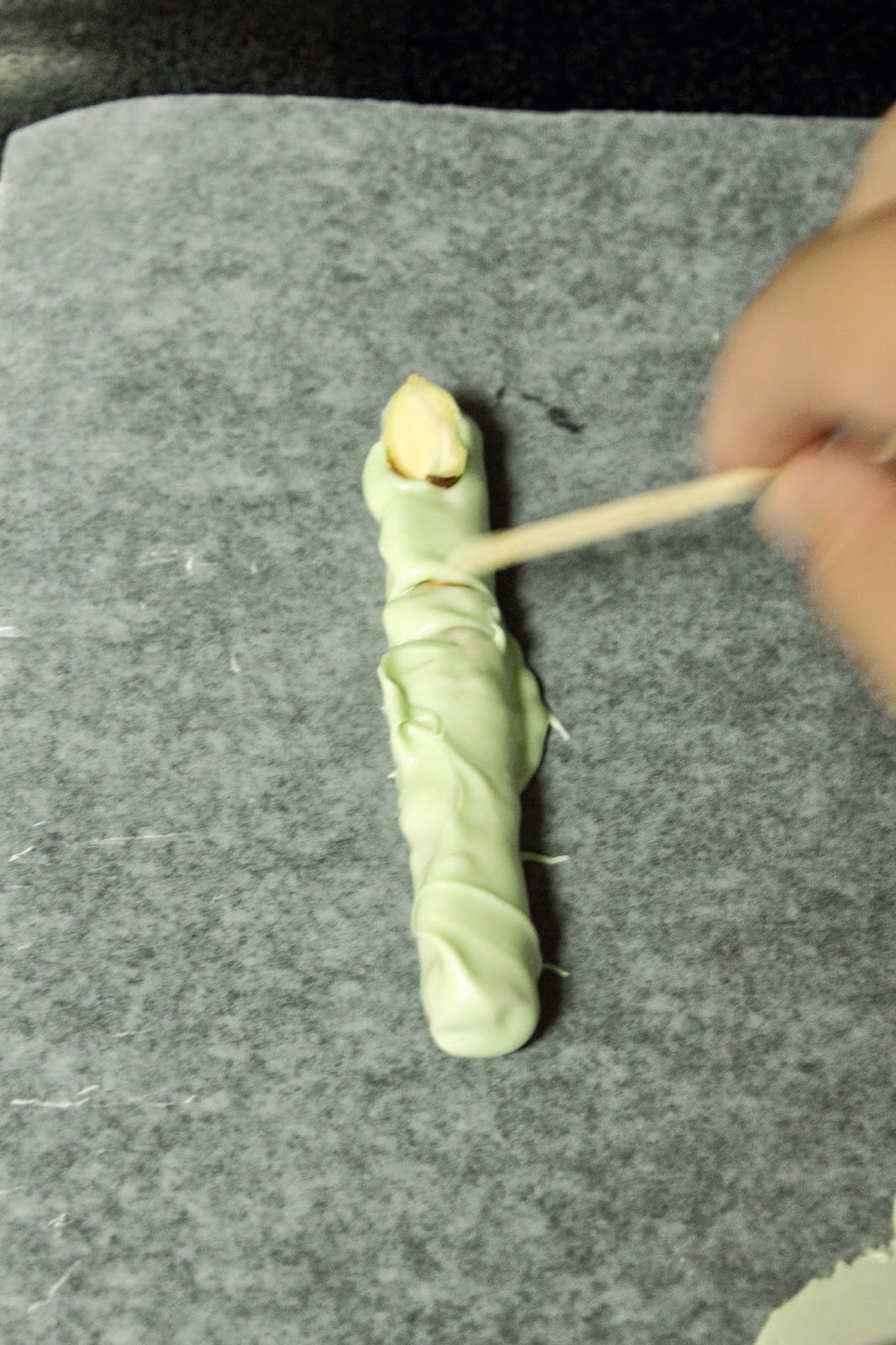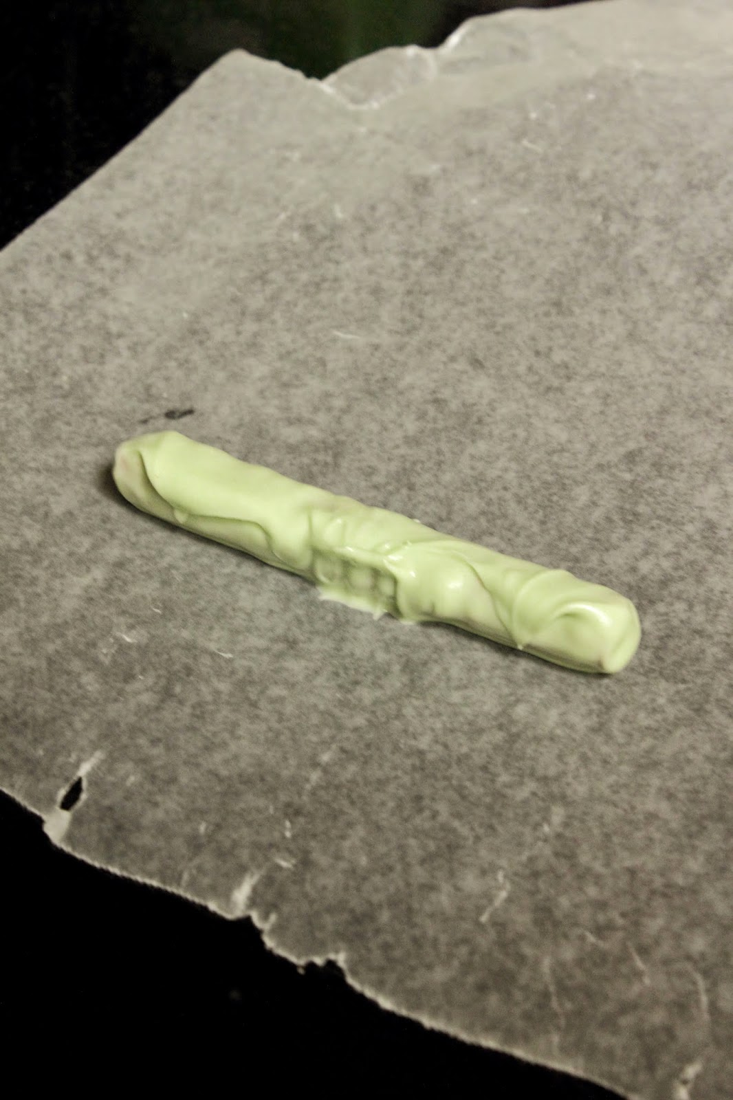 Before making the knuckle lines, let the pretzel set about 2 minutes. Using a toothpick make three lines in the middle of the pretzel. I started with a straight middle line then curved lines above and below, like parenthesis around the middle line. I recommend wiping the toothpick off after each line. If the coating sticks out after making the lines smooth it by running the toothpick gently down the side.