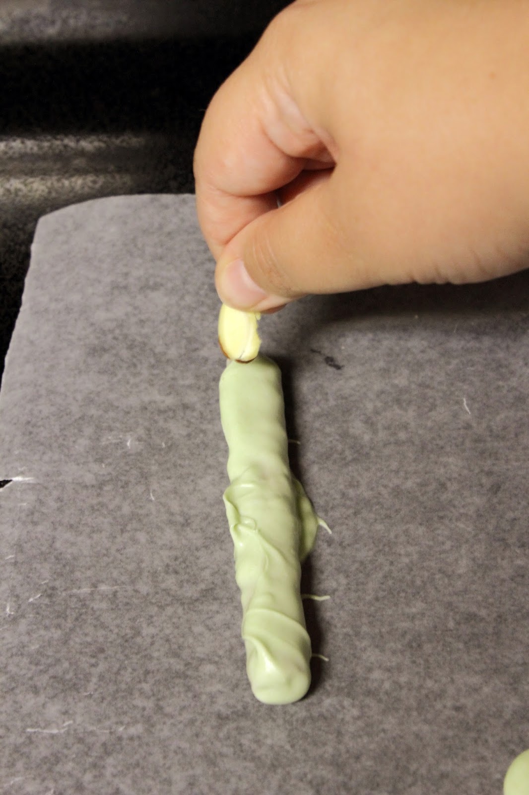 Apply a sliced almond to the end of the pretzel while the coating is still melted.