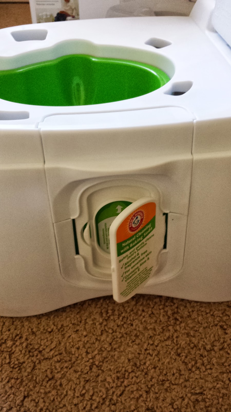 The potty comes already set up and the first thing mommy and I noticed when we opened it was the smell. Not a nasty smell, but a very nice smell that smells almost like something I can eat. It turned out to be the Arm & Hammer Deodorizing disc with odor eliminating baking soda which is used for odor control. I don’t think I’ll need an air freshener with that around. Noticed the way it is shaped? It can be used as a step stool. I stepped on it and there was no fear of it tipping over. Very sturdily made I should say.