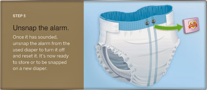 Next you snap the alarm on your diaper. It’s just like snapping in on those button tabs.