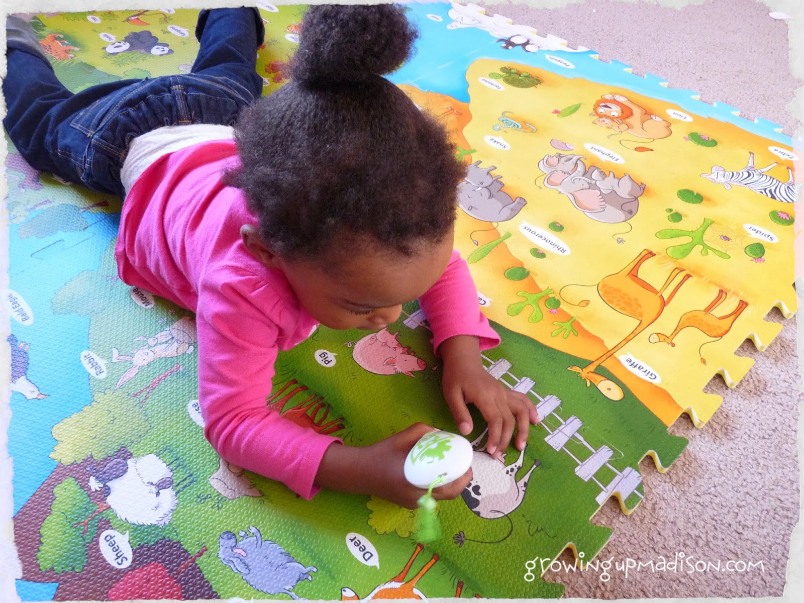 I having been using my Creative Baby i-Mat to learn the different animals and the sounds they make. There are four different parts of the world and I get to learn what animals live in each of that part of the world. There is the desert, animals you can find on the farm, animals in the water and animals in the forest. One of the game asks me to find the animal that says certain sounds or I can find the animal they ask me to find. Mommy did a little video where you can see it for yourself. The illustrations are beautifully done and the colors are so vivid. Mommy’s photos don’t do them justice at all.