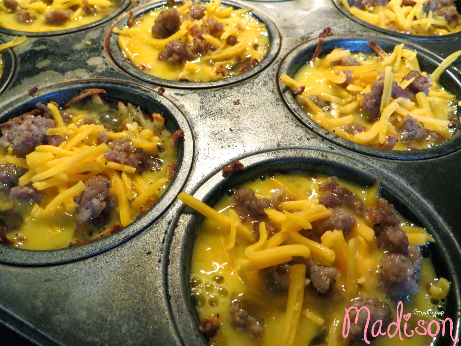 6. Take half of the shredded cheese and sprinkle in the bottom of the cups. Repeat with half of the sausage crumble.