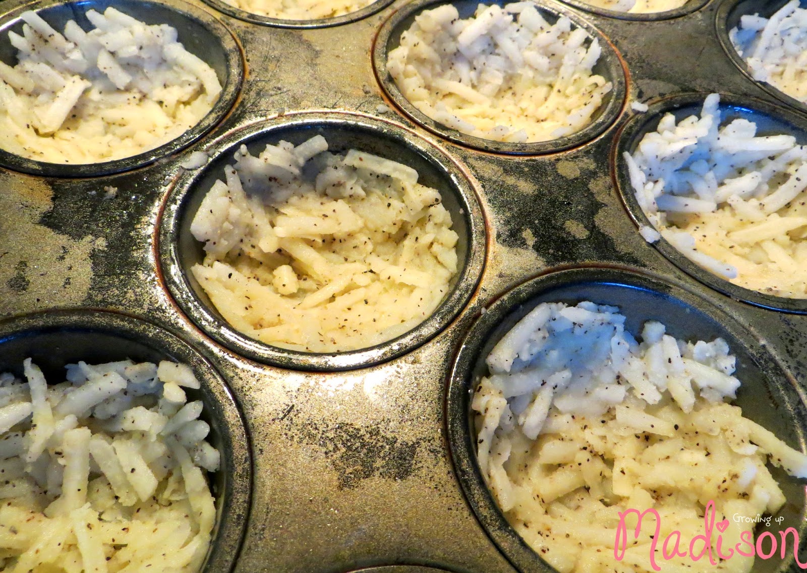 3. Spray a muffin tin with cooking spray. Fill the cups about 3⁄4 of the way full with the hash browns. Press with your fingers to mold the hash browns to the cups all the way to the top. Try to make the sides the same thickness all the way around for even cooking. Make sure there are hash browns on the bottom of the cup.