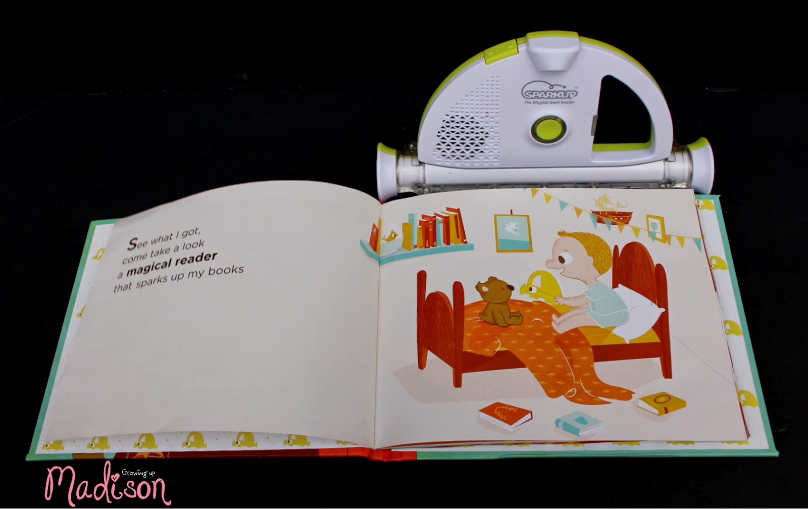 I just love, love, LOVE to read and I also love being read to. Sometimes though that isn’t always possible although I would love it to be. There are times when mommy is so tired that all she can do is read one book to me before it’s time for bed while I want to read at least twenty. Then there are times when I’m by myself and I just grab a book and start reading, well I do try and read but since I don’t know the words I can just look at the pictures which is fine with me. Well what if I tell you that there is a product out there that would help to solve all my problems and I’ve found it. I bet you want to know what I’m talking about. Well let me introduce you to Sparkup The Magical Book Reader.