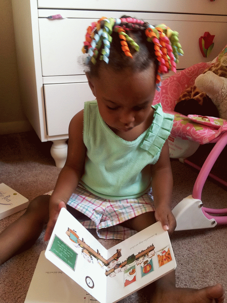Reading plays a big part in it. Constantly read to your toddler. It’s one of the reason I have so many books and I enjoy reading them with mommy. Help your child build vocabulary by repeating words over and over, building on them and being descriptive. Don’t just label items, describe them. For example if your child can say dog like I can, then you would say “dog says woof” or “dog is black/white”. Touch and feel books are great for this and even a trip in the car and to the grocery store can help with this. Describe the other vehicles you pass by and the fruits and veggies that you pick out in the fruit and vegetable section. Not only is the apple red but the apple is red and round.